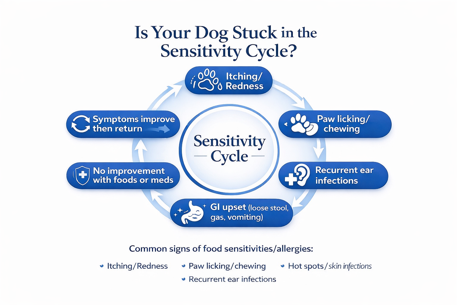 For sensitive dogs, too many ingredients and frequent food changes can make symptom patterns harder to understand and delay progress. Our approach starts with clarity: use sensitivity screening to help guide ingredient selection, build a stable baseline, and keep the diet consistent.