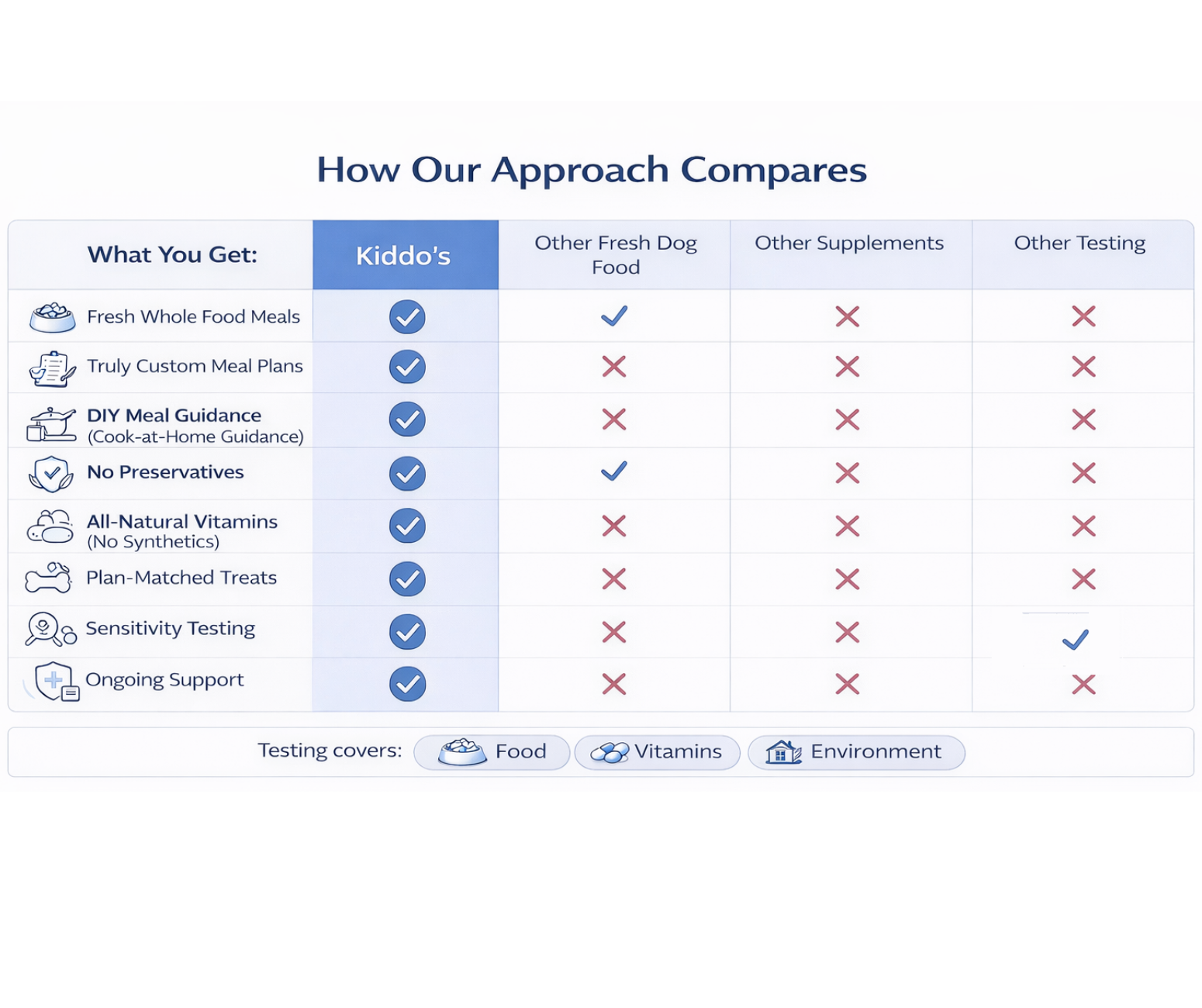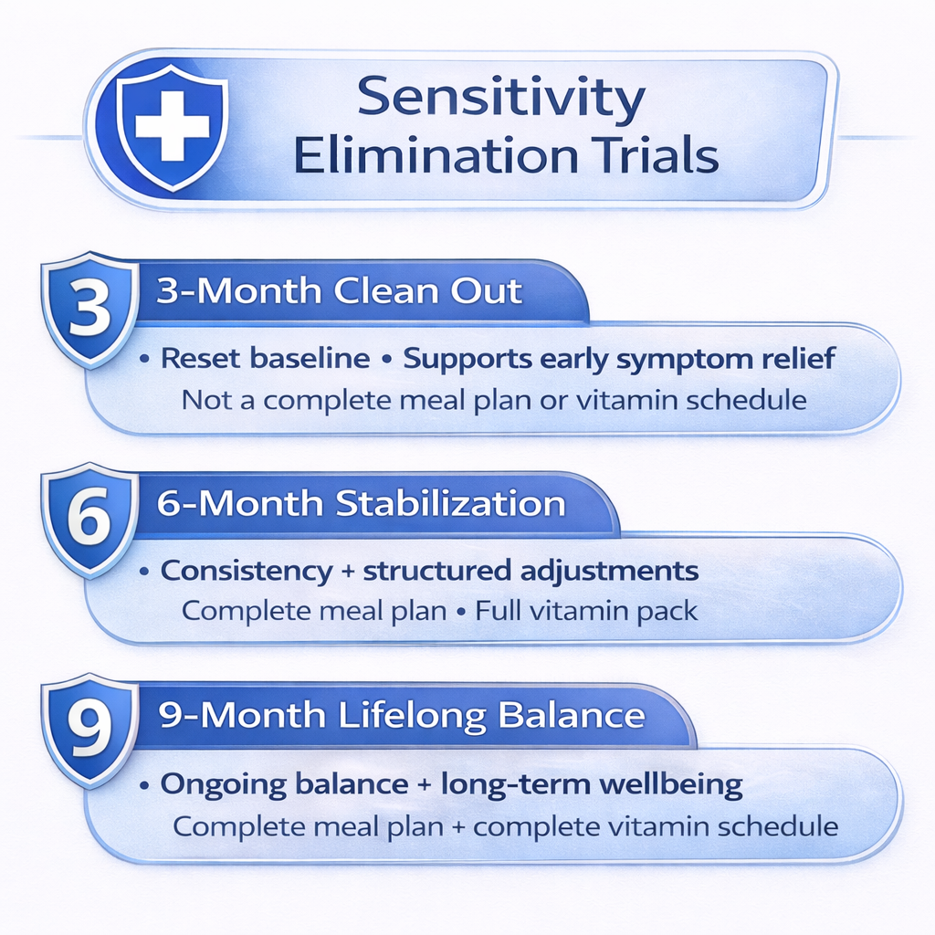 All dogs receive an at-home sensitivity test that screens for reactions to foods, vitamins, preservatives, additives, and environmental factors. This helps us identify triggers, create a clear nutritional starting point, and build an informed support plan.